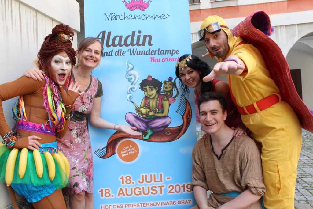 Zum sechsten Mal findet Nina Blums Märchensommer nun schon in der Steiermark statt. Diesen Sommer darf sich Jung und Alt auf eine Neubearbeitung der Geschichte von Aladin freuen. Der Hof im Priesterseminar wird in einen bunten, arabischen Bazar verwandelt, der orientalisch klingt und duftet. Freut euch auf „Aladin und die Wunderlampe…Neu erleuchtet!“ – ein Stück speziell für Kids zwischen 4 und 12 Jahren sowie Menschen, die Märchen lieben.