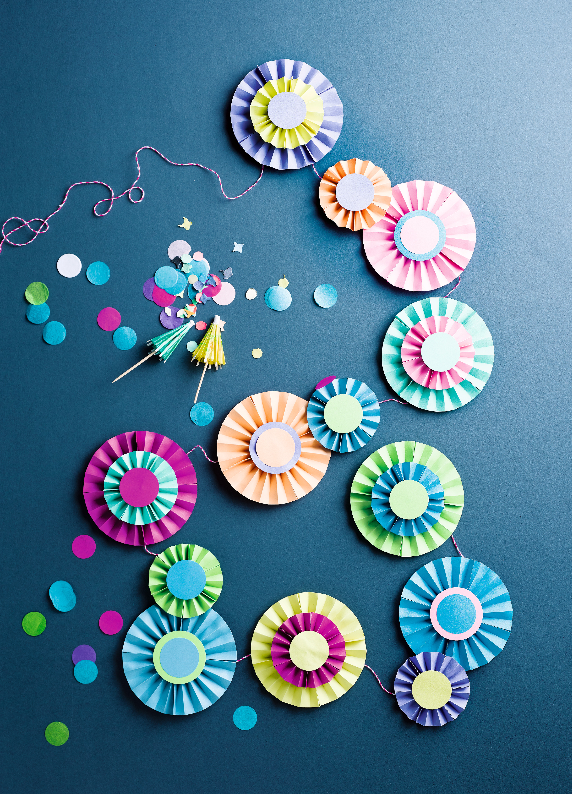 4 Stanze dir aus dem restlichen Papier zwölf kleine Kreise und vier große Kreise heraus. Auf vier große Rosetten klebst du mittig einen großen Kreis und auf diesen einen kleinen Kreis. Die restlichen kleinen Kreise klebst du mittig auf die kleinen Rosetten.