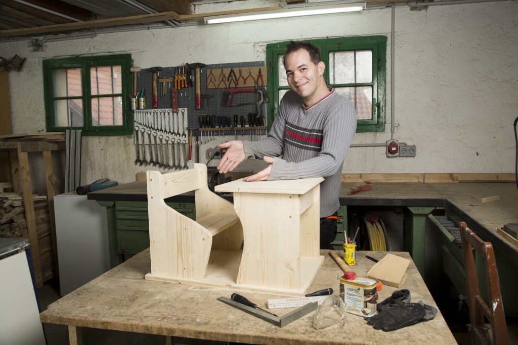 Also klickte er sich durch die vielen erhältlichen Kindermöbel, nahm da und dort Anleihen und Maß. Und fertigte auf Basis dieser Anregungen eine Zeichnung an, wie das ideale Essbänkchen für Tochter Marlene aussehen sollte. Mit der Skizze ging er zu einem Baumarkt, ließ sich insgesamt neun rechteckige Teile zuschneiden, die er dann in seiner Werkstatt mit der Stichsäge in die genaue Form gemäß seiner Skizze brachte. An einem Nachmittag in der Werkstatt war das maßgefertigte Essbänkchen fertig! Für Material (Holzplatten und deren Zuschnitt im Baumarkt) hat Stefan 30 Euro ausgegeben.