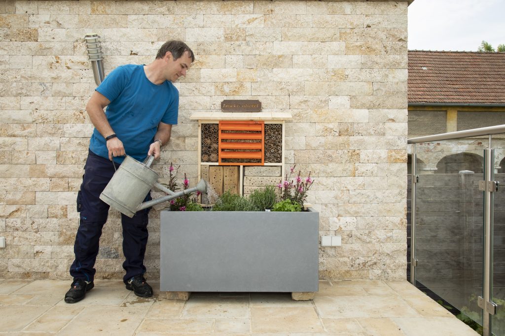 Abgesehen von den Holzlatten (plus Holzscheiten, möglichst aus Eiche oder Buche, denn diese Hölzer haben viel Gerbsäure und sind pilzresistent) und Schrauben braucht es dafür eine Schilfmatte, Bambusrohre und ein Hasengitter. Dazu etwas Stroh, einen Ziegel, vielleicht Tannenzapfen. Und bei Gefallen wasserlöslichen Lack, möglichst in einem Rot- oder Braunton – dieser lockt Insekten an. Ein Blumen- oder Kräuterkisterl als „Hotel-Garten“ gehört auf Balkon oder Terrasse ohnehin zur Grundausstattung.