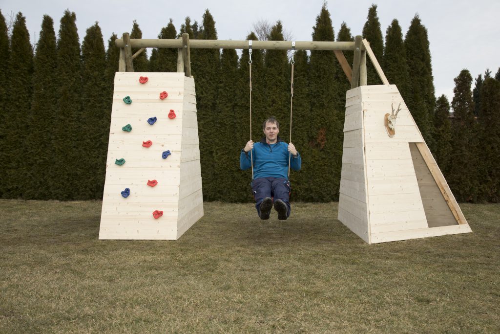 Was man noch braucht: Wenn anstelle einer Leiter die Stützen links als Häuschen verbaut und rechts mit einer Extra-Stütze ein „Zelt“ angebaut werden, sind rund 17 m2 Holz (Fichte) nötig, Stefan hat dazu 20 cm breite Bretter (18 mm stark) verwendet. Zudem ein Kant- oder Rundholz von ca. 3 m Länge. Klettergriffe gibt es ab 25 Euro.