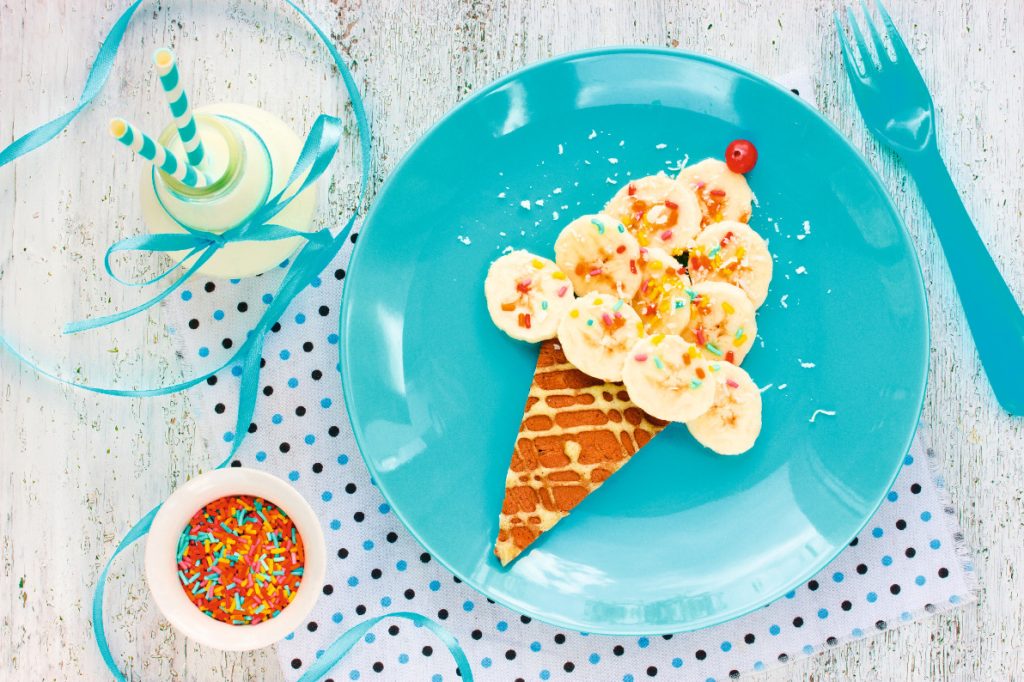 Bei diesem Bananeneis kommt Sommerlaune auf! Eine Waffel als Tüte, Bananenscheiben als Eiskugeln, bunte Streusel und als Draufgabe eine Ribisel. Das schmeckt!