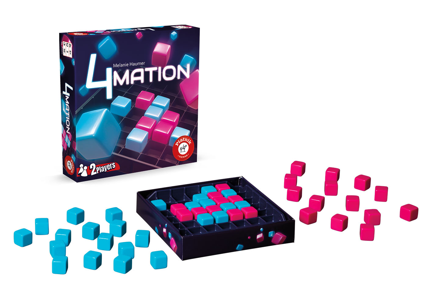 „4mation“ wird im Schachteleinsatz gespielt, ein Spieler erhält 24 blaue, der andere 24 pinke Würfel. Abwechselnd werden nun die Würfel in den Raster/Einsatz gesetzt – immer so, dass der eigene Würfel an eine Seite oder Ecke des zuletzt gesetzten gegnerischen Würfels angrenzt. Tricky wird das Ganze dann, wenn man sich dem Rand des Spielfelds nähert. Wer dort nämlich nicht mehr regelgerecht setzen kann, darf an einem beliebigen anderen gegnerischen Würfel ansetzen und damit dem Kontrahenten unliebsame Überraschungen bereiten. Ist eine Viererreihe geschafft, endet das Spiel sofort und die Revanchepartie kann beginnen.