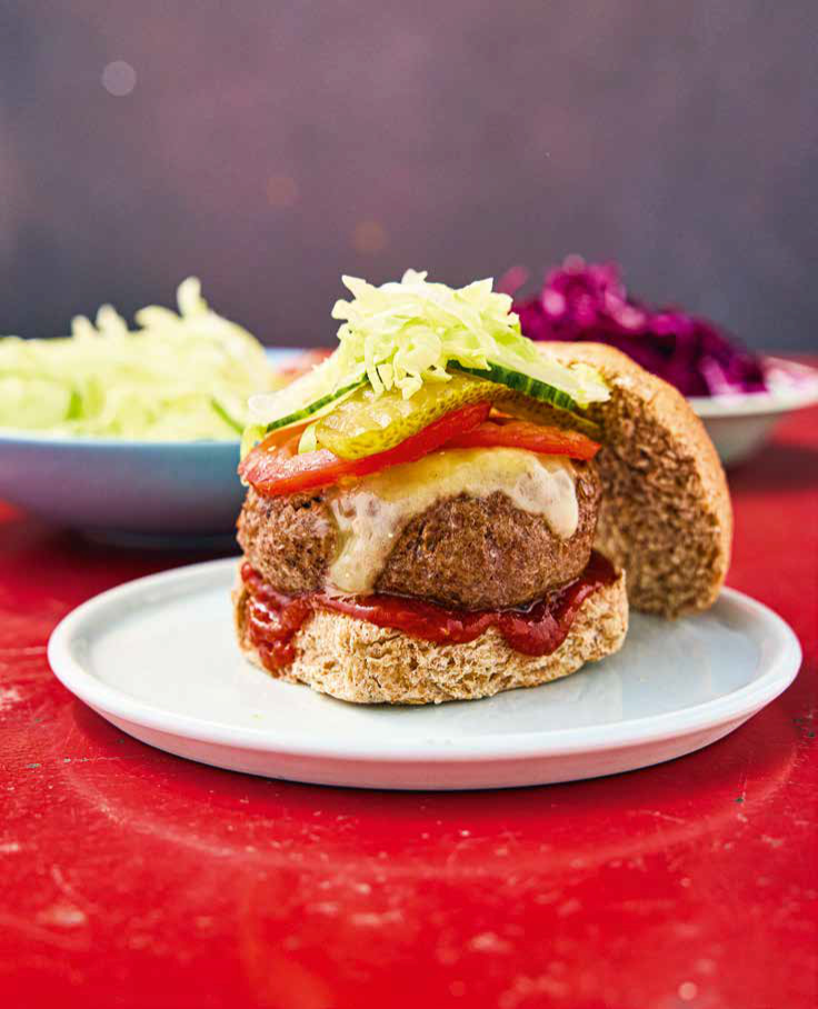 7 Belege deine Burger mit den Gewürzgurken, den Tomaten, den Gurkenscheiben und etwas Salat und lege die oberen Brötchenhälften darauf. Die Reste der Gurken, Tomaten und des Salats sowie den Rotkohl servierst du getrennt dazu.
