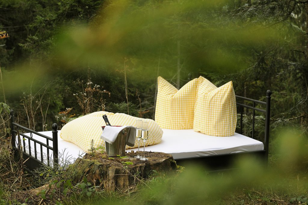 Das Holzhotel Forsthofalm etwa ist nicht nur eine ideale Sommerdestination für einen Urlaub auf 1050 Metern Höhe in wunderschöner Alleinlage in Leogang. Vor allem Romantiker sind hier bestens aufgehoben, denn sie übernachten in einem Bett mitten im Wald. Nach einem Fünf-Gänge-Abendessen bei Kerzenschein im Restaurant KUKKA geht es ausgestattet mit einer Taschenlampe, in den nahe gelegenen Wald. Dort wartet nicht nur ein feiner Schlafplatz unterm Sternenzelt, sondern auch eine Flasche Champagner. Und wem das noch nicht reicht, der bucht das Angebot „Liebesgeflüster auf der Alm“ und erhält zusätzlich eine Partnermassage, ein Ölbad für Zwei und ein Kuschelfrühstück.
