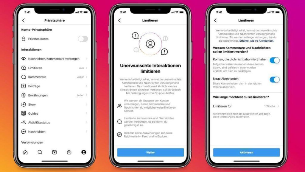 Mithilfe der Limitieren-Funktion lassen sich automatisch Kommentare und Nachrichtenanfragen von Personen auszublenden, die einem nicht oder erst seit Kurzem folgen. Damit will Instagram erreichen, dass sich Menschen in einer Phase starker oder intensiver Belästigung schützen können, während sie gleichzeitig weiter mit ihrer langjährigen Community Kontakt halten.