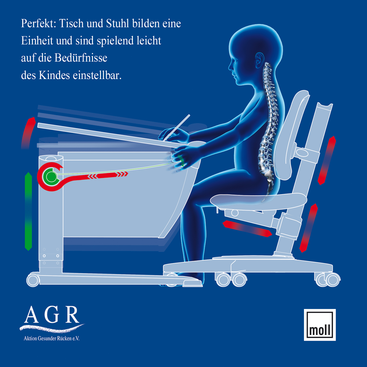 Um einen gesunden Kinderrücken zu unterstützen, müssen Tisch und Stuhl eine Einheit bilden und auf das Kind abgestimmt sein. Dazu gilt es, die folgenden Punkte zu beachten: