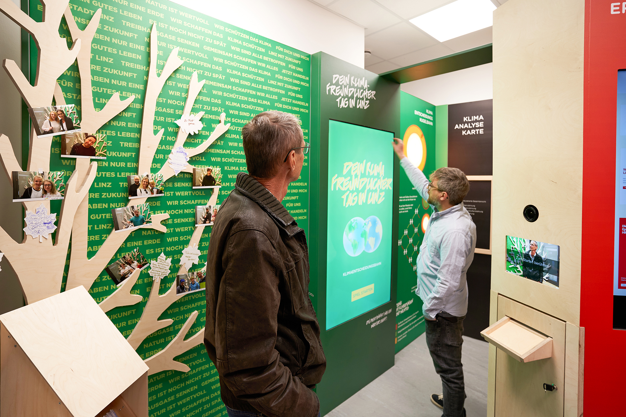 Sechs zur Verfügung stehende multimediale, audiovisuelle Installationen laden zum Mitmachen ein. Die LinzerInnen entdecken dadurch das Linzer Stadtklima und mögliche zukünftige Auswirkungen. Beispielsweise bietet der Klimatanz die Möglichkeit, die Geschwindigkeit der Erderwärmung am eigenen Körper nachzuspüren, während beim Kugelbahnspiel Alltagssituationen im Sinne des Klimaschutzes gemeistert werden müssen. Mit der von der Linz AG gesponserten Fotobox können Fotos für den Klimawunschbaum gemacht und die eigenen Ideen zu Klimaschutz bzw. Wünsche für die Stadt Linz dokumentiert werden.