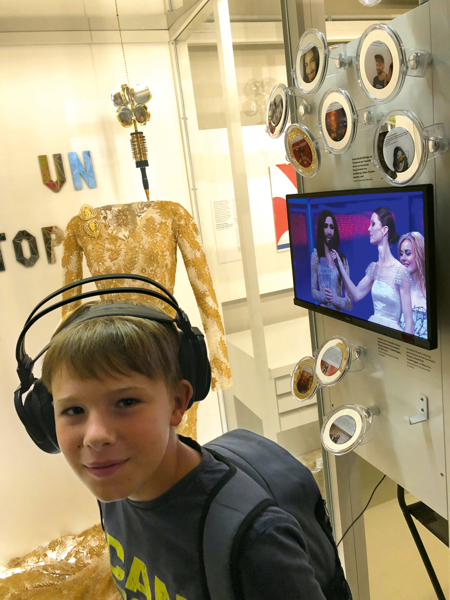 In der großen Ausstellung, in der sich alles um die österreichische Geschichte von 1918 bis 2018 dreht, ist der glamourösen Kunstfigur eine ganze Vitrine gewidmet. Neben einem schillernden Kleid als Exponat und einem Videodokument vom Song-Contest-Abend ist darin auch eine eigene Lego-Figur der „Queen of Austria“ zu sehen. „Ich kenne ihr Lied mit dem Phönix, weiß sonst nicht viel über Conchita, außer dass sie sich als Frau verkleidet“, sagt Benjamin, „ich finde aber gut, dass sie sich so zeigt, wie sie sein will.“ Vom ehemaligen UN-Generalsekretär Ban Ki-moon wurde die prominente Österreicherin für ihren Kampf gegen Intoleranz und für Menschlichkeit gelobt. Als Vorreiterin und exponierte Freiheitskämpferin ist Conchita damit im Haus der Geschichte genau richtig. Was ist sonst noch vom Museumsbesuch geblieben? „Ich habe wirklich viel über Österreich und die Geschichte des Landes erfahren“, sagt Benjamin. „Ich weiß jetzt wirklich viel über den Zweiten Weltkrieg. Was ich davor nicht wusste, ist, wie viele Menschen damals aus unterschiedlichsten Gründen im Gefängnis waren.“