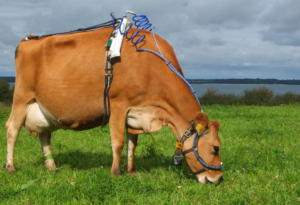 Ausgerechnet der Weidehaltung wurde dies bisher oft angelastet, da sie häufig niedrigere Milchleistungen – und somit auch höhere Methanemissionen pro Liter Milch – erzielt als eine Stallhaltung mit hohem Kraftfutter- oder Maisanteil in der Ration. Ob das tatsächlich so ist, ist Gegenstand vieler aktueller Forschungen. Deswegen haben Forschende der Agrar- und Ernährungswissenschaftlichen Fakultät der CAU auf dem Versuchsgut Lindhof im Rahmen des EU-Projektes „SusCatt“ über ein Jahr hinweg die Milchleistungen von weidenden Jersey-Kühen erfasst und es wurden in mehreren Kampagnen die Methanemissionen der weidenden Kühe von der Doktorandin Cecilia Loza (Abteilung Grünland und Futterbau/Ökologischer Landbau – Professor Friedhelm Taube) gemessen. Die Kühe weideten hierbei in zwei Gruppen jeweils auf einer einfachen Grünlandmischung aus Weißklee und Weidelgras, oder auf einer diversen Mischung mit acht Arten inklusive Wiesenkräutern und weiteren Leguminosen. Zudem erhielten sie täglich im Stall eine geringe ergänzende Kraftfuttergabe von zwei Kilogramm – dies entsprach ungefähr 12 bis 15 Prozent der gesamten Trockenmasseaufnahme. Gerade artenreiche Grünlandbestände haben den Vorteil, dass sie weitere Ökosystemdienstleistungen erbringen: Zum Beispiel liefern sie Nektar für blütenbesuchende Insekten.