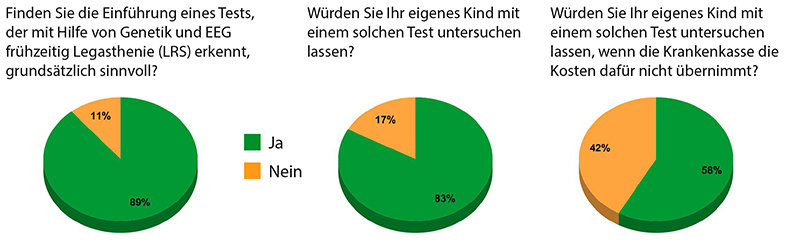 Dass ein solcher Frühtest auf positive Resonanz stoßen würde, zeigen auch die Ergebnisse einer repräsentativen Umfrage unter Eltern von Kindern im Alter zwischen drei und sieben Jahren, also der späteren Zielgruppe. Darin bewerteten fast 90 Prozent der Befragten einen solchen Test als sinnvoll, mehr als 80 Prozent würden ihr eigenes Kind damit untersuchen lassen – mehr als die Hälfte davon sogar, wenn die Krankenkasse die Kosten nicht übernehmen würde. Selbst Bundeskanzlerin Angela Merkel zeigte bereits großes Interesse an solch einem Testverfahren. Im Februar dieses Jahres hatte sie das Projekt Legascreen eingeladen, sich als eines von zehn besonders innovativen Forschungsvorhaben im Rahmen der Veranstaltung „ Perlen der Forschung “ vorzustellen. Darin erklärte Projektleiterin Angela D. Friederici der Kanzlerin ihre Vision: „Wenn wir es schaffen, beispielsweise im Zuge von Vorsorgeuntersuchungen einen Großteil der betroffenen Kinder rechtzeitig, noch vor Schulbeginn zu erfassen, können gezielte Förderungsmöglichkeiten in dieser sensiblen Phase der Hirnentwicklung viele Defizite kompensieren. Wir ersparen ihnen damit nicht nur Leid in der Schule. Wir eröffnen ihnen damit auch die gleiche Chance auf eine erfolgreiche Ausbildung, auf Teilnahme in der Gesellschaft und ein zufriedenes Leben.“