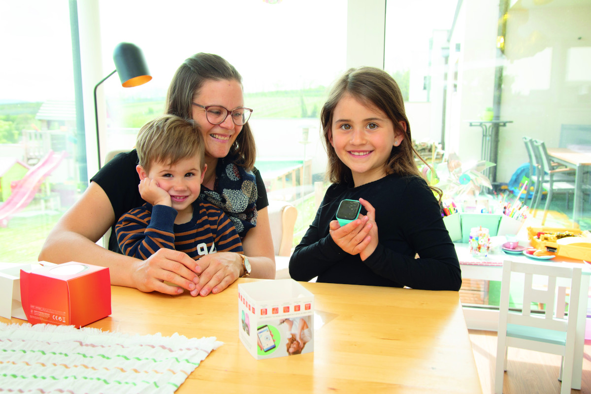 © Ben Leitner – Gemeinsam mit ihrer Mama Andrea und ihrem Bruder Julian, 3, entdeckt Volksschülerin Elena, 7, ihre neue Kidswatch.