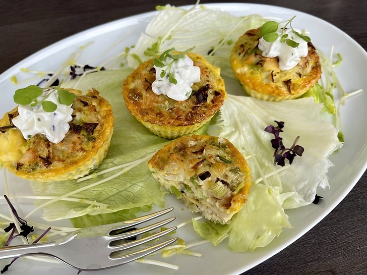 - Das kleingewaschene und klein geschnittene Gemüse vermische ich mit dem Käse, den zuvor klein geschnittenen Forellenstücken und den aufgeschlagenen Eiern.