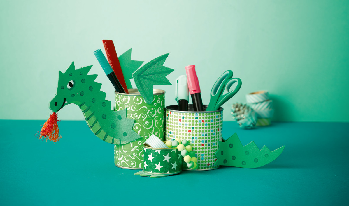 5 Toll gemacht! Jetzt brauchst du nur noch Kopf, Schwanz, Fuß und Flügel an die Dosen zu kleben und schon wacht der Drache über deine Schere, Stifte und Lineal.