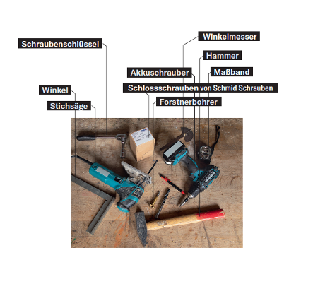 Für Stefans maßgeschneiderte und dazu deutlich billigere Sitzgarnitur braucht es bloß sechs herkömmliche 115 Zentimeter lange Zaunpfähle (sie kosten im Baumarkt im Vergleich zu ebenso langen Kanthölzern deutlich weniger!), zwei mindestens 160 Zentimeter lange Kanthölzer mit 90 Millimeter Kantenlänge sowie neun jeweils zwei Meter lange Glattkantbretter, 95 Millimeter breit und 19 Millimeter stark. Wie beim Holz soll man auch bei den Schrauben nur auf beste Qualität zurückgreifen, denn die Gartenmöbel sollen Wind und Wetter viele Jahre lang widerstehen. Ein professionelles Bohrerset (mit Forstnerbohrer) haben versierte hello-familiii-Bastler ohnehin im Sortiment.