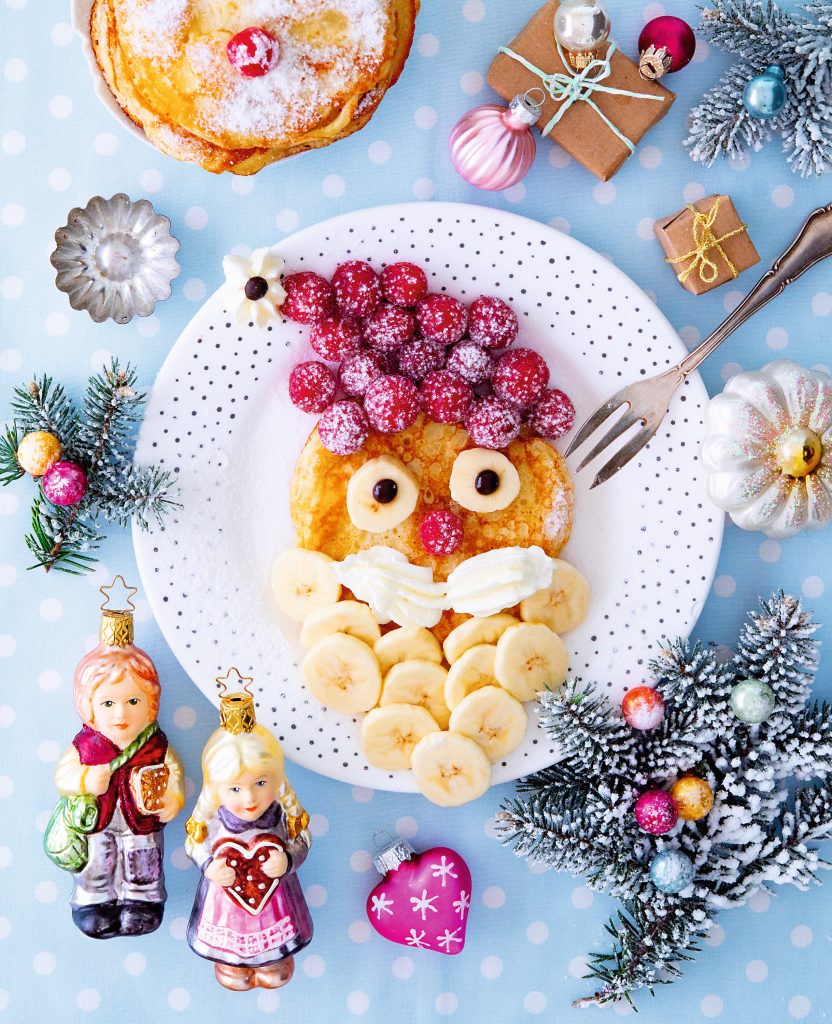 3. Für einen Weihnachtsmann-Pancake eine Banane in Scheiben schneiden. Zwei Scheiben als Augen auf den Pancake legen und den Rest gefächert als Bart unterhalb des Gesichtes verteilen. Rote Früchte oben als Hut verteilen und eine Himbeere als Nase in die Mitte legen. Etwas Sprühsahne als Schnurrbart und oben an die Mütze geben. Einen Schokodrop auf die Mützen-Sahne und je einen Drop auf die Bananen-Augen legen. Fertig ist das morgendliche Weihnachtsfest.
