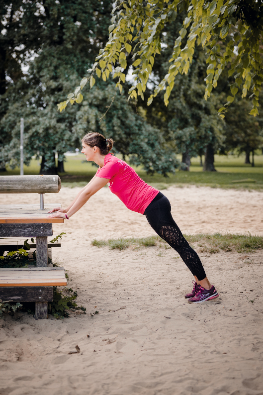 Ausführung: Auf einer erhöhten Fläche mit den Händen stützen und den gesamten Körper in eine Ebene bringen. Bauchnabel und Beckenboden ziehen fest nach innen, der Kopf ist auf der Brust. Nun abwechselnd die Beine strecken, wobei der Körper stets auf einer Ebene bleibt und die Hüfte NICHT zur Seite oder das Gesäß nach unten kippt.