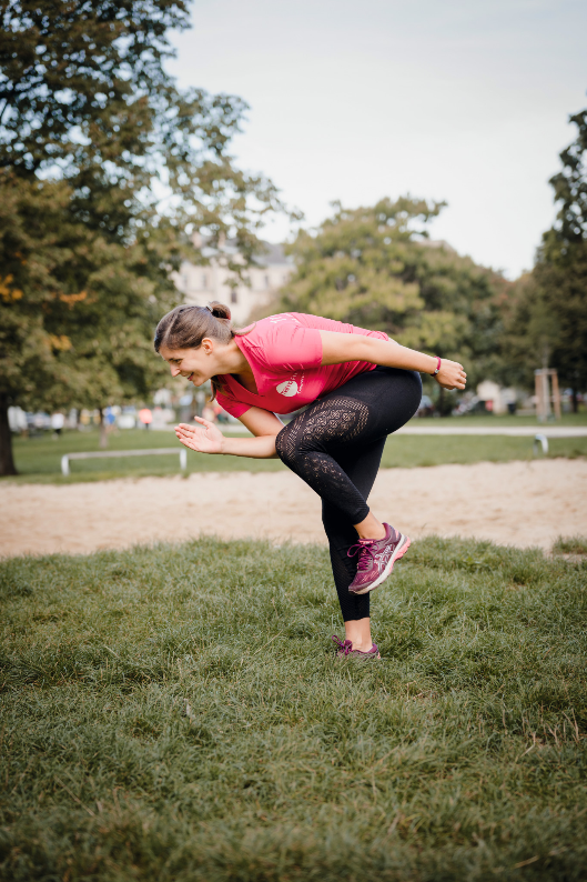 Ausführung: Hebe ein Bein und den diagonalen Arm an und lehne dich mit dem Oberkörper so weit nach vorne, wie du kannst und möchtest. Du kannst dich bei dieser Übung auch mit dem freien Arm festhalten! Mit der Ausatmung ziehst du deinen Bauchnabel weit nach innen und bringst deinen Ellbogen zum diagonalen Knie (oder die Hand zum Fuß, falls der Babybauch schon im Weg ist). Mit der Einatmung streckst du Arm und Bein wieder nach oben.