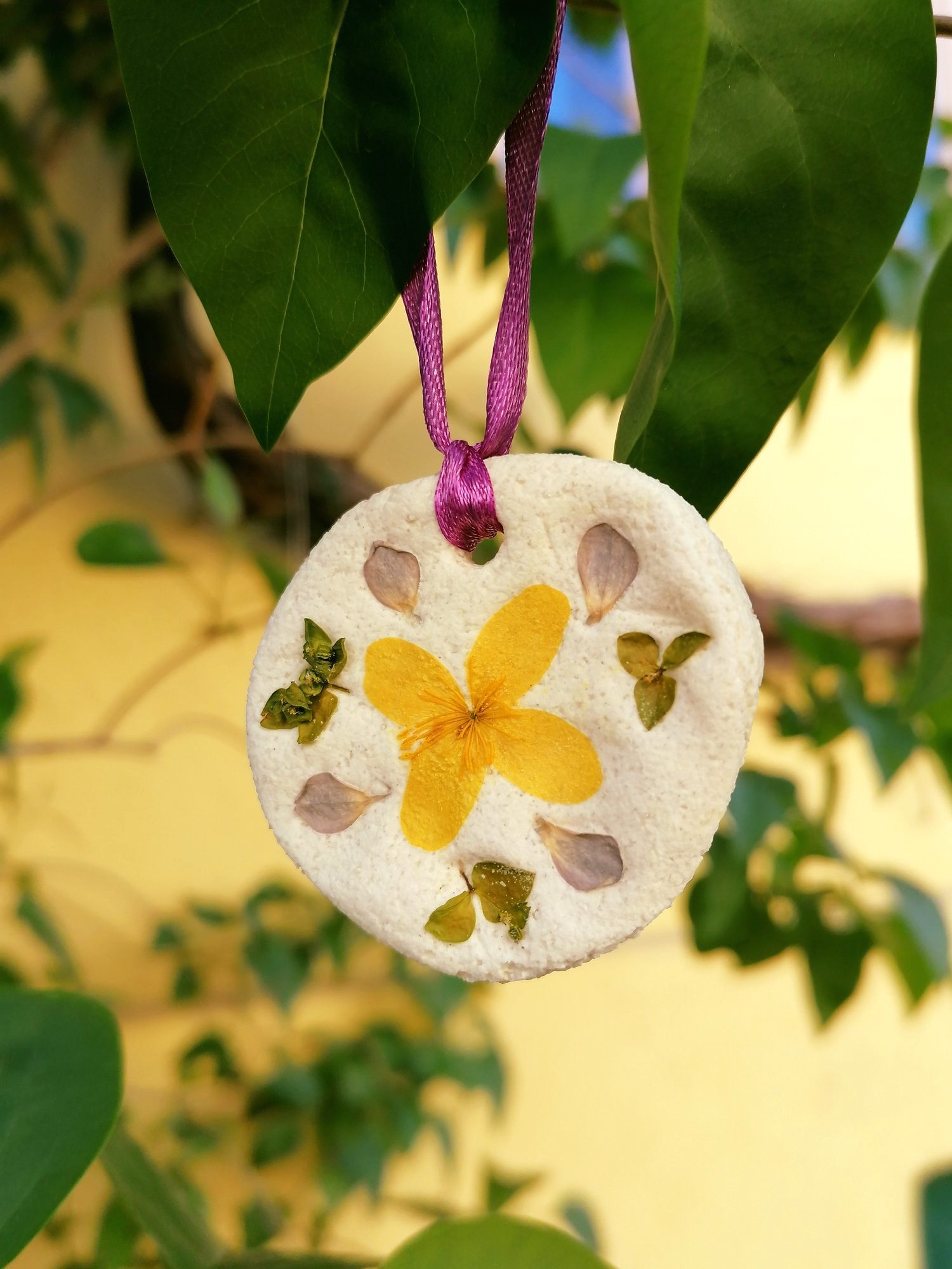3. Jetzt den Teig auf ca. 1 cm ausrollen, mit einem Glas ausstechen und mit den gesammelten Blüten, Blättern… verzieren. Drückt dafür Blütenblätter und Co. einfach ein bisschen in den Teig. Zum Schluss noch ein Loch zum Aufhängen in den Anhänger machen (z.B. mit einem Strohhalm) und fertig ist der Blütenanhänger.
