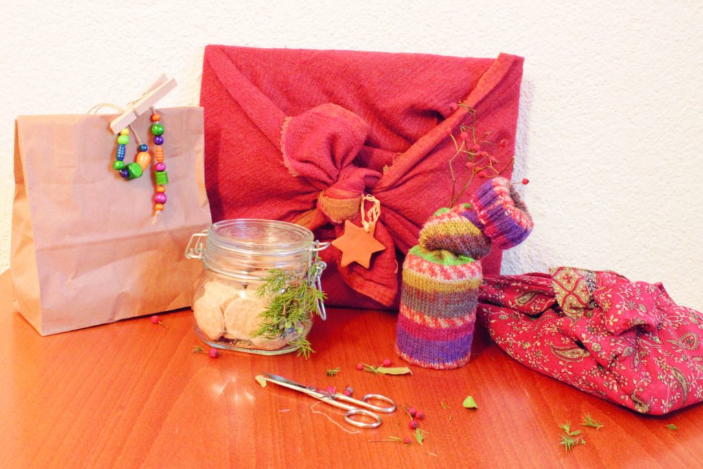 So gut wie alles, was einem an übrigen Textilien entgegenkommt, kann ein zweites Dasein als Geschenkverpackung finden. Dazu eignen sich zum Beispiel Kissenbezüge, Geschirrtücher oder Wollsocken (die dann gleich auch Teil des Geschenks sein können). Wer Stoffreste zu Hause hat, der kann gemeinsam mit der Familie wiederverwendbare Geschenksäcke gestalten. So hat jedes Familienmitglied seinen eigenen Geschenksack – eine schöne Tradition, die meist mehrere Jahre weiterlebt. Eine weitere umweltfreundliche Verpackungsalternative ist die japanische Wickeltechnik mit dem Namen Furoshiki. Dabei wird ein rechteckiges Tuch oder ein Schal speziell gefaltet und das Geschenk damit umwickelt. Entweder, man schenkt das Tuch gleich mit, oder es landet nach Weihnachten wieder an seinem gewohnten Platz im Haushalt. Vielfältige kostenlose Furoshiki-Anleitungen für so gut wie alle Geschenkformen finden sich online.