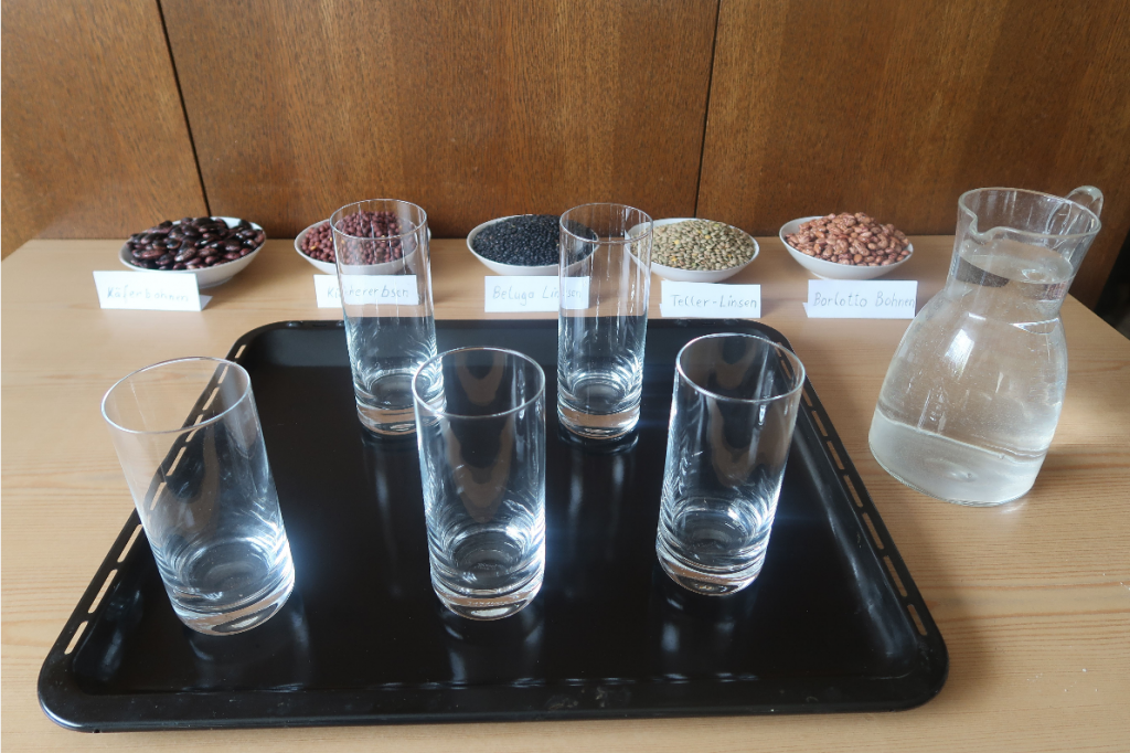 Pro Hülsenfrucht-Sorte benötigst du ein Glas. Befülle es zur Hälfte mit Wasser.